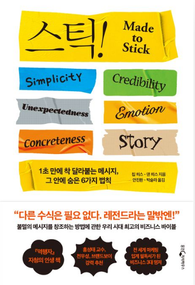 *Stick*은 아이디어가 오래 기억되고 확산되기 위한 구체적이고 실천 가능한 전략을 제시하는 책입니다. 칩 히스와 댄 히스는 단순히 정보 전달이 아닌, 사람의 인지 구조와 감정 반응을 고려한 ‘진짜 커뮤니케이션’의 기술을 풀어냅니다. 이 책은 마케터, 기획자, 교육자, 발표자 등 누구에게나 강력한 무기가 될 수 있습니다.